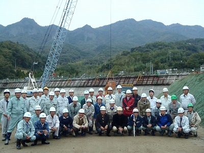 コンクリート打設中の堤体をバックに、記念撮影。 |
