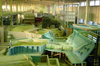 現在、ダム水模型実験施設では鹿野川ダムにおけるトンネル洪水吐きの実験、鶴田ダムにおける放流管増設に伴う減勢工の形状に関する実験、新しい形式である治水専用ダムの放流設備に関する実験などを実施しております。
