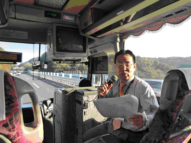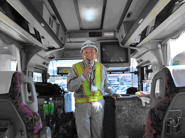 | バス車中にて津軽ダムの概要、工事用道路などについて説明を受ける |