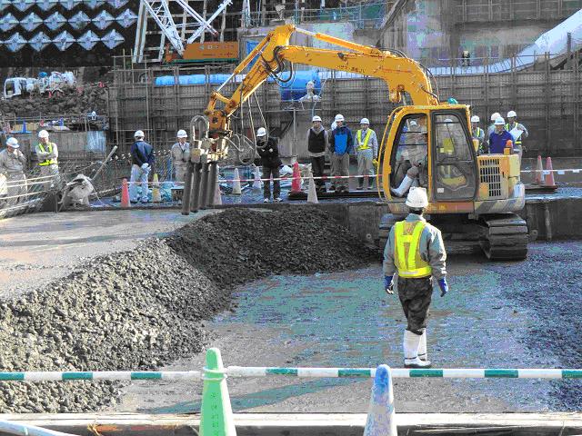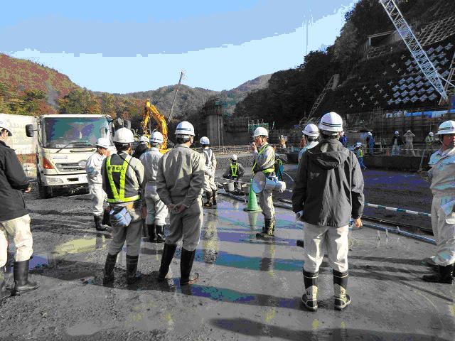 | 堤体打設面の見学。バイブロによる締固め様子に真剣に見入る見学者。 |