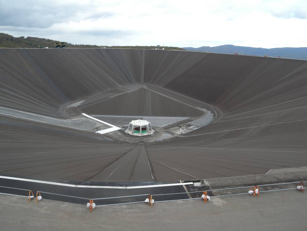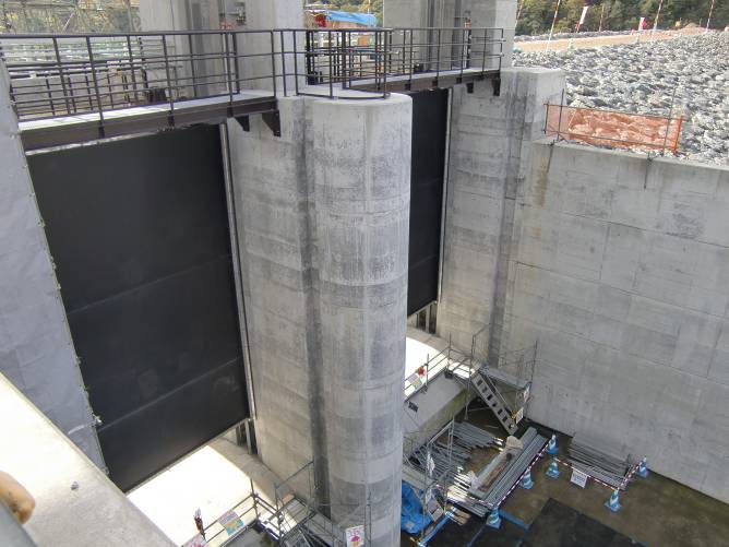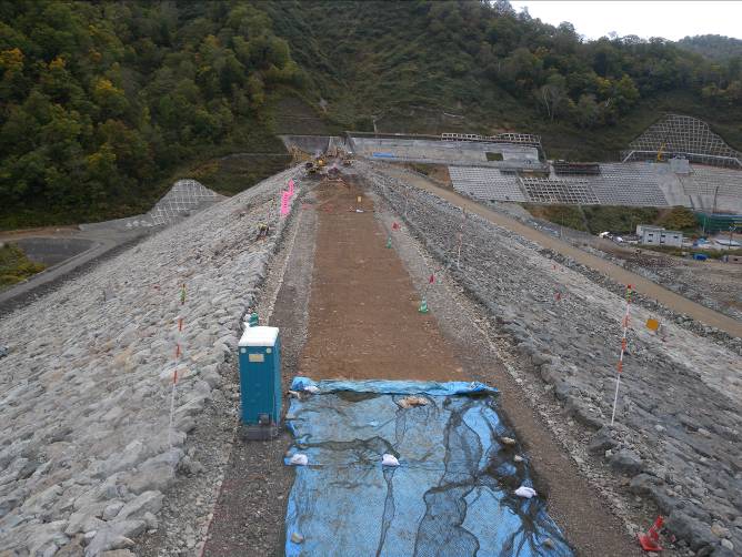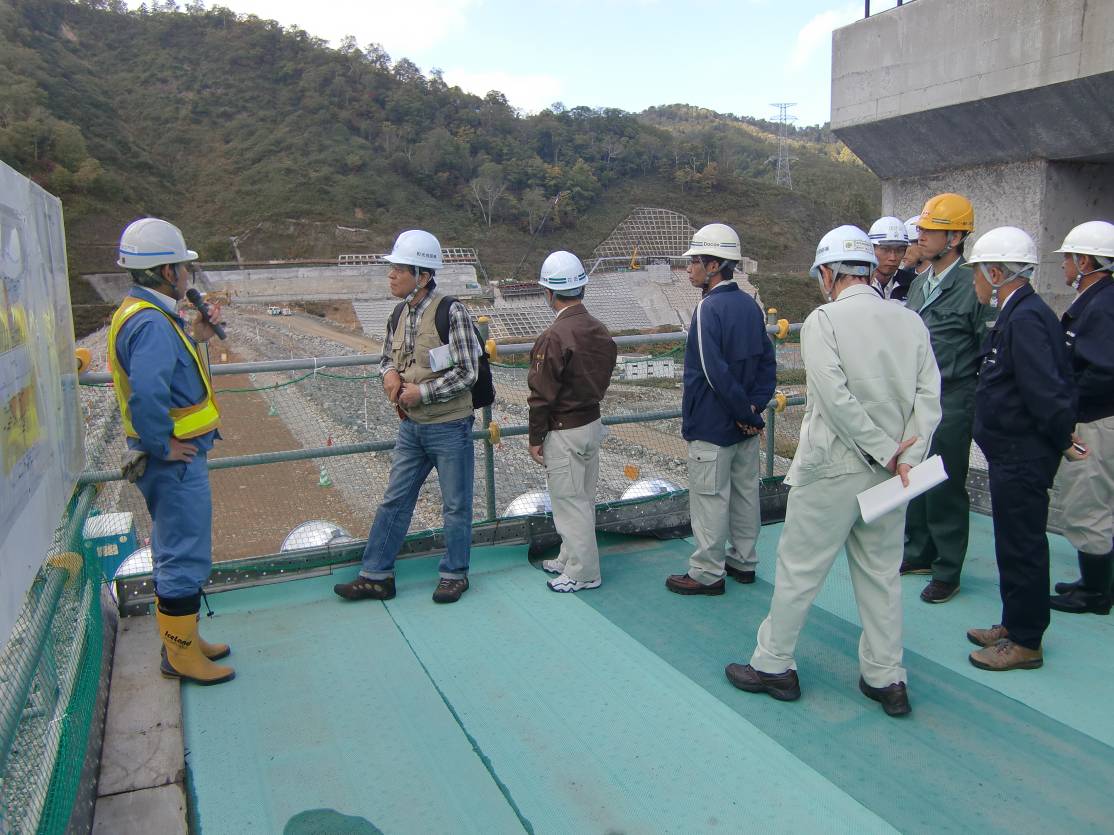 アスファルト表面遮水壁を採用している上部調整池では、表面遮水壁の施工状況を見学し、中央土質遮水壁型ロックフィルダムの下部京極ダムでは、堤頂部や洪水吐きの施工状況を見学しました。