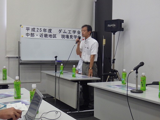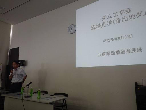 現地到着後、見学先を代表して兵庫県光都土木事務所の糟谷所長より開会の御挨拶をいただいた後、同事 務所の吉田課長より金出地ダムの事業概要を説明していただきました。