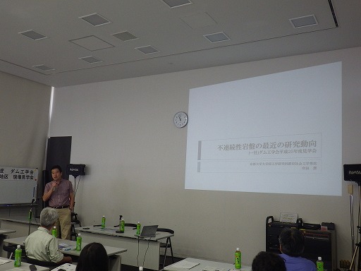その後の講演会では、京都大学大学院工学研究科の岸田准教授より「不連続性岩盤の最近の研究動向」と 題し、大規模ダム(黒部ダム等)建設における我が国の岩盤工学の深化や、マルパッセダム(フランス)決壊事故