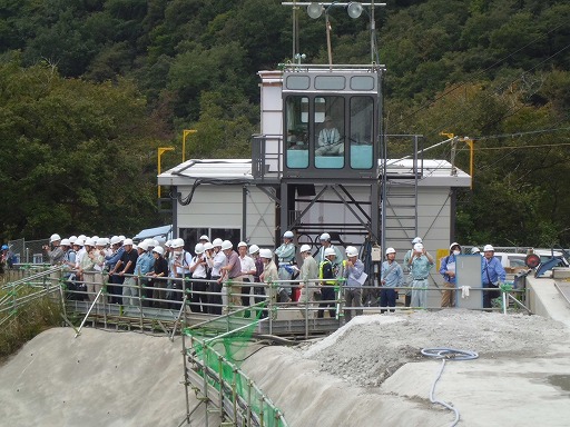 講演会終了後、昼食休憩を挟んで、金出地ダムJV の西浦副所長より「施工状況と見学ルート」の御説明 をいただきながら、金出地ダムサイトへバス移動しました。現場到着後、右岸天端付近の展望台にて工事の 全景を見ながら工事概要を説明していただいた後、骨材貯蔵設備やコンクリート打設現場を見学しました。