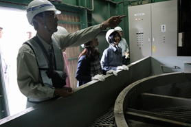 見学は、清水建設・五洋建設・井森工業・ナルキ特定建設工事共同企業体事務所(以下:平瀬ダムJV)で工事概要とダムの役割とその貢献について説明を受け、バッチャープラント(操作室含む)や打設面、骨材設備など、通常の見学では立ち入ることのできない場所を見学しました。また全箇所において平塚所長から、日常に置き換えた例を用いて、現在の工事内容から施工上の工夫点など、土木知識のない方々へ非常に分かり易く、興味を惹かれる説明をいただきました。