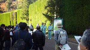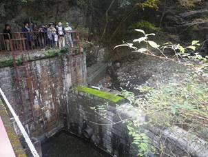 当日は、午後13:30布引ハーブ園にある風の丘中間駅に集合し、2班に分かれて、神戸市水道局事業部施設課松本浄水係長の挨拶のあと見学会をスタートしました。見学会は布引五本松ダムの上流から重要文化財に指定されている施設を中心に巡り、各施設の前で、神戸市水道局の松下計画調整課担当課長ならびに武永浄水管理センター保全係長による詳しい説明が行われました。見学コースとしては、貯水池上流の分水堰堤から始まり、締切堰堤、放水路の呑口および吐口、布引五本松ダム、谷川橋、雌滝取水堰堤等、布引五本松ダムでは、監査廊の中も見学することができました。いずれも、明治から大正時代に築造された歴史的建造物で、一つ一つの造りに工夫がなされ、当時の異国を思わせるような気ちになりました。