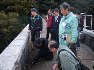 特に分水堰堤は、明治41年に建設された布引五本松ダムに導水するための放水路(延長264.3m、幅3.0m)に伴う切石積みのアーチ堰堤で、周囲の風景と調和したこれも歴史を感じさせる施設でした。分水堰堤付属橋は明治40年に建設された橋長11.5m、幅1.2mの当時は全国的にも先駆的な鉄筋コンクリートアーチ橋です。今回のツアーでは見学者全員がこの橋を渡ることができました。布引五本松ダムは、明治33年に建造された堤高33.3m、堤頂長110.3m、堤体積22,000m3(耐震補強コンクリート分3,300m3は除く)の日本最古の重力式コンクリートダムです。特に布引五本松ダムを見学している際は、見学者からの質問も多数見受けられ、写真撮影にも余念が無い様子でした。また天端高欄に刻まれた、吉村長策技師、佐野藤次郎技師、浅見忠治技師の名前には敬意を評すべく感激の声も上がり、歴史的な建造物の凄味を肌で感じることができました。