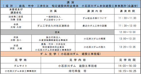 ダム工学会九州地区連絡会では、今年度で13回目となる現場見学会および講演会を、去る平成29 年10 月 6日(金)に「小石原川ダム」にて開催し、無事終了しましたので御報告致します。
