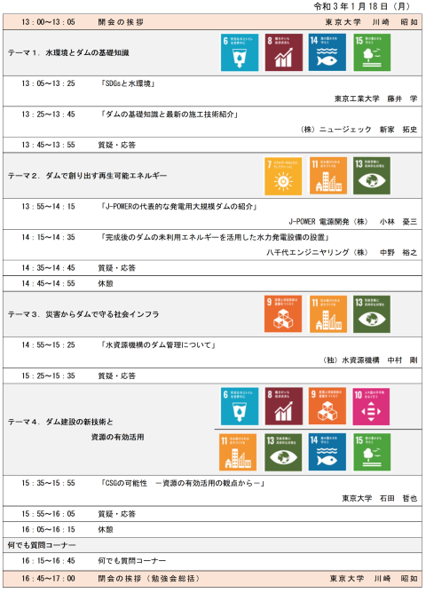 今回、ダム工学会若手の会では、SDGsの多くの目標が「土木・環境工学」と関連することに着目しました。そのなかでもダム工学会若手の会が専門とするダム事業に絡め、SDGsの各ゴールに対してダム事業が貢献できることについてオンライン講演というかたちでの勉強会を実施しました。