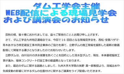 本年度は、西松建設(株)、(株)安藤・間、青木あすなろ建設(株) 特定建設工事共同企業体の協力を得て、熊本県の「立野ダム」の建設見学会を WEB