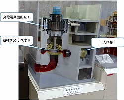 新豊根発電所の紹介では、新豊根ダムが非対称放物線アーチダムであることを建設当時の平面図と一緒に紹介いただきました。さらに、新豊根発電所の最大発電能力についても、発電水車の模型図と一緒に語っていただきました。