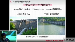 Hisa様より揚水式水力発電の概要として、その種別、発電型式、揚水式発電方法、運転周期についてご紹介いただきました。揚水発電所の型式別などのマッピングされた図やダムと発電所の位置関係を3Dで示した図を用いるなど、一般の方にも揚水発電の仕組みが理解しやすいわかりやすいご説明でした。