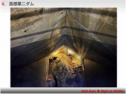 下池になる高根第二ダムについては、中空重力式コンクリートダムであり内部空間には基礎岩盤が露頭していること、上池である高根第一ダムは、中部電力が建設したの最初のアーチ式ダムで堤高130mもあることなどを紹介いただきました。