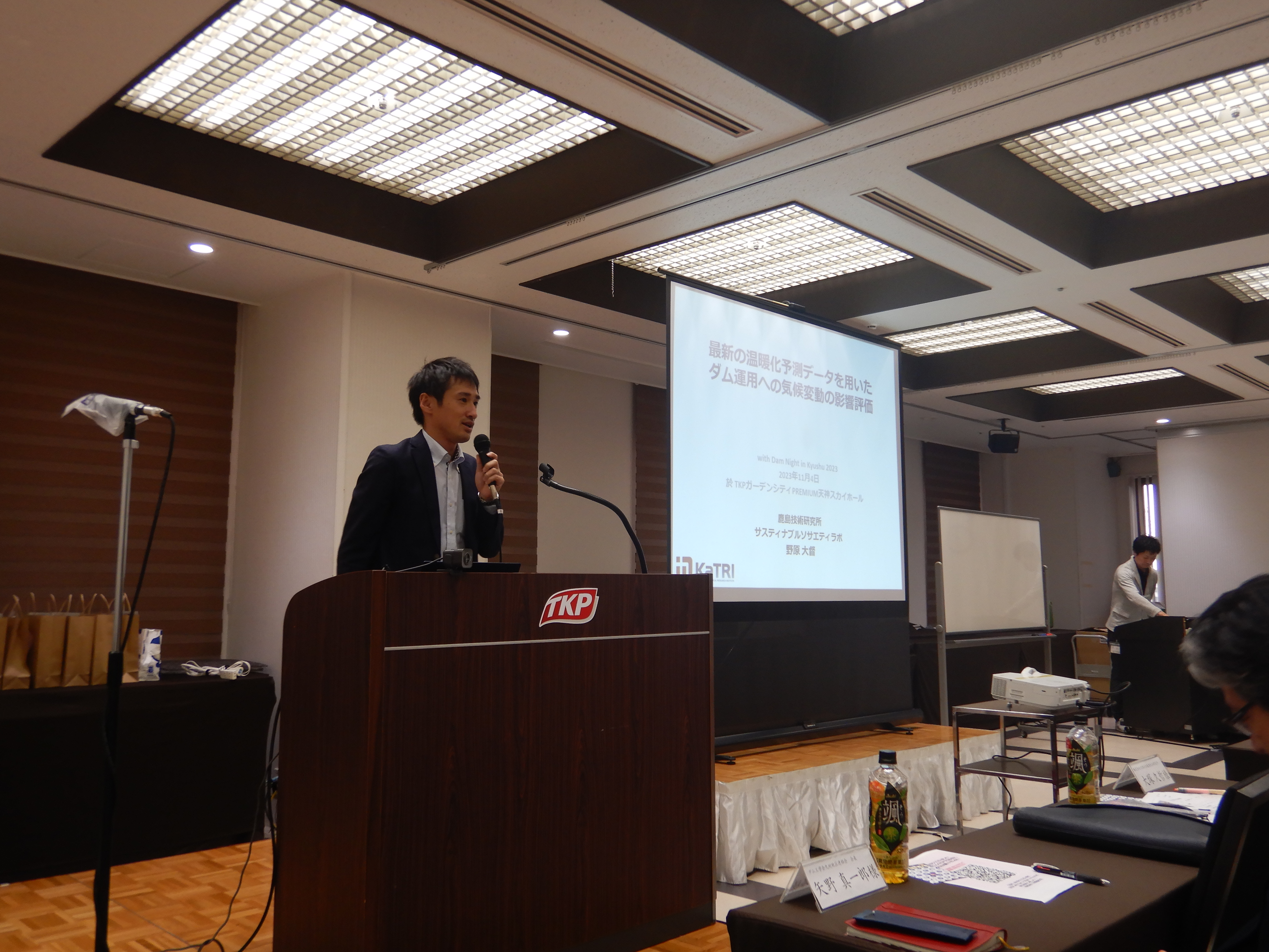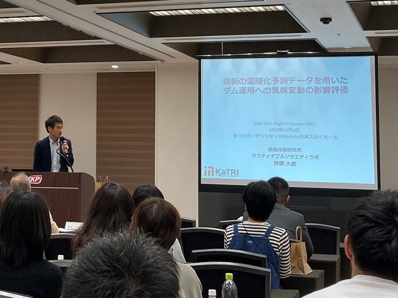 最新の研究結果から、近年の気候変動伴う水資源の変化(水害の激甚化)や気候変動予測データを用いたダムの利水・発電運用への気候変動影響評価等のとても興味深い内容を分かりやすくご説明していただきました。筑後川流域を事例とした戻り梅雨の影響評価は、九州でも馴染みのある松原ダム・下筌ダムでの仮想実験結果をご説明いただき、来場者もイメージが付きやすいものであったと思います。まとめでは、近年の気候変動を鑑み、洪水調節機能の増大と渇水リスクの評価を行い、ダム運用の見直しが重要であることやそのためにはソフト対策に加えて、ハード対策やダム群での連携・役割分担等の最適化が重要であると発表いただきました。