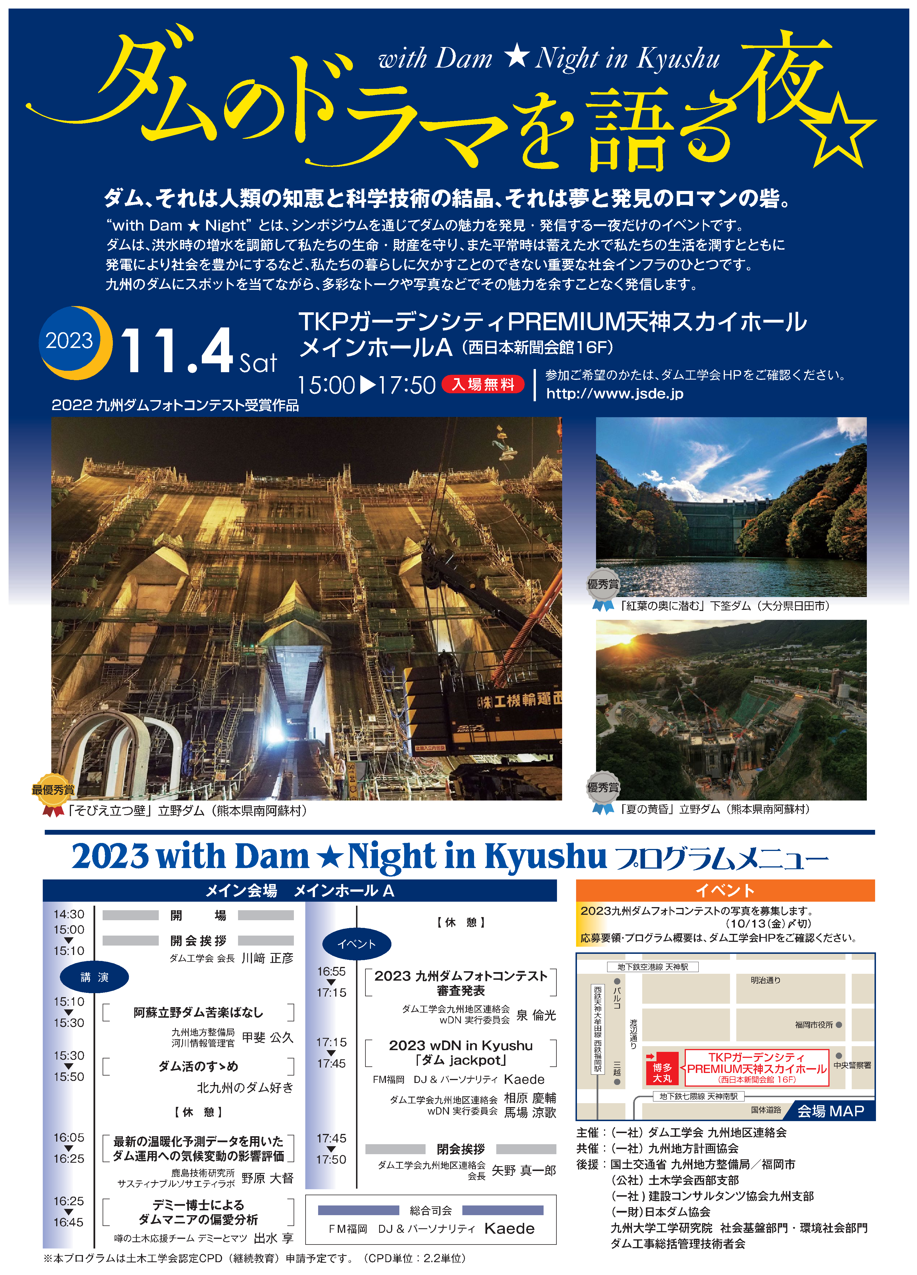 ダム工学会九州地区連絡会では、今年度で8回目となる「with Dam ★ Night in Kyushu」を、令和5年11月4日(土)に福岡市中央区のTKPガーデンシティPREMIUM天神スカイホール・メインホールAにて開催し、滞りなく終了しましたので御報告致します。