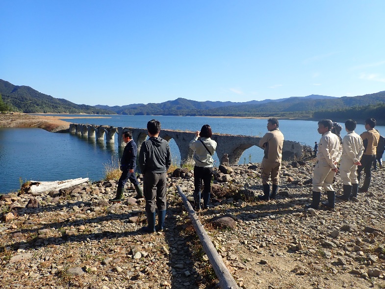 昭和12年に音更川支流であるタウシュベツ川に架けられた旧国鉄士幌線の橋梁。糠平ダム建設により、昭和30年に士幌線が新ルートへ切替えられ、本橋梁自体は湖の中に残され現在に至る。本見学会では専用ガイドが同行して、直接タウシュベツ川橋梁へ行き見学した。