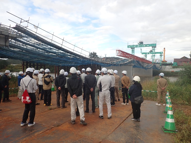 馬追橋は今から120年ほど前に初めて架設された橋で、現在は6代目になるが、鉄筋露出や床版の劣化など老朽化が進んだため7代目への架替工事が行われている。本見学会では架替工事の状況と馬追橋現場に隣接したコンクリート工場で馬追橋主桁や一般コンクリート製品の製造状況を見学した。