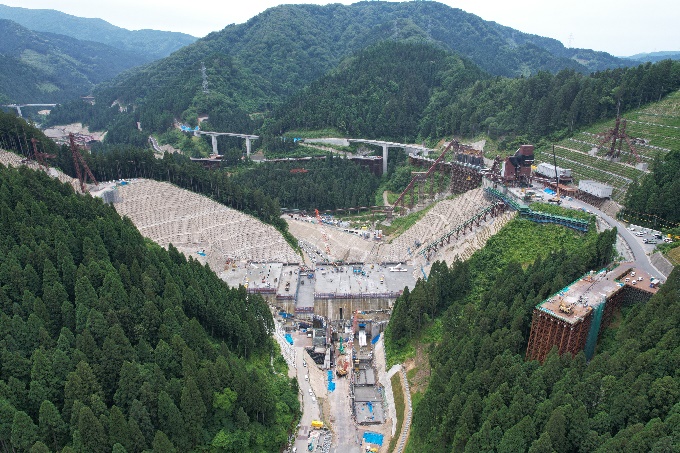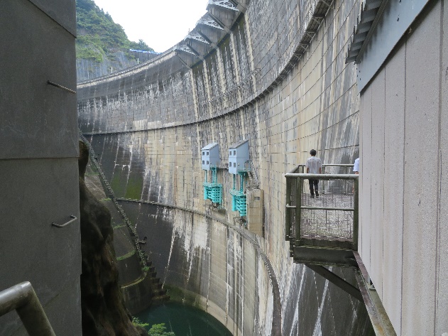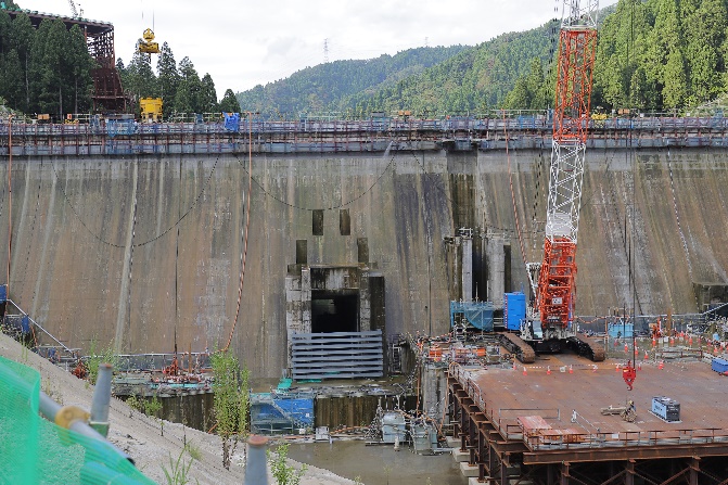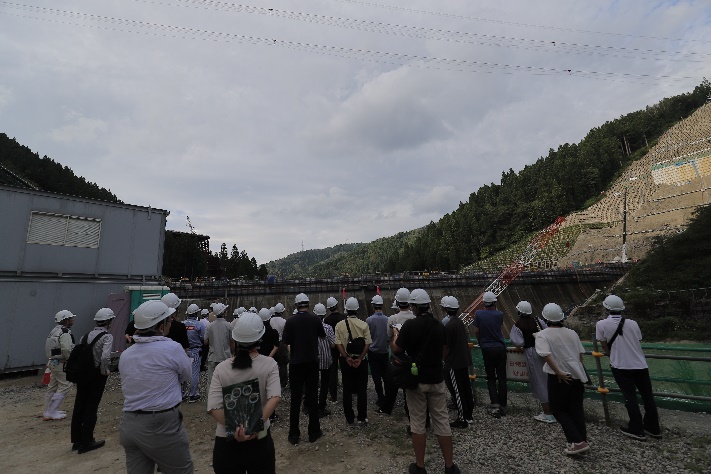 その後、バスで足羽川ダムの建設現場へ移動し、ダム管理者様及び施工業者様にはダムを間近に見ながら工事の進捗状況や各施設の機能・特徴をご説明いただき、ダムに対する理解を深めることができました。