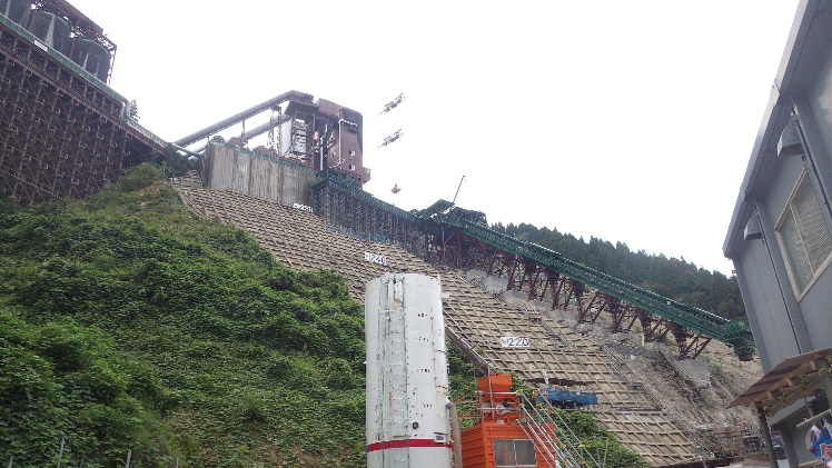 また、コンクリート製造設備をはじめとするダムの施工設備も見学しましたが、多くの学生はダムの施工設備を見ることが少ないため、その規模の大きさに驚いていました。ダムの上流側に移動した際には、まだ稼働していませんでしたが足羽川ダムのダム本体施工の目玉であるプレミアムベルコトコンベアーを見ることもでき、貴重な経験となりました。