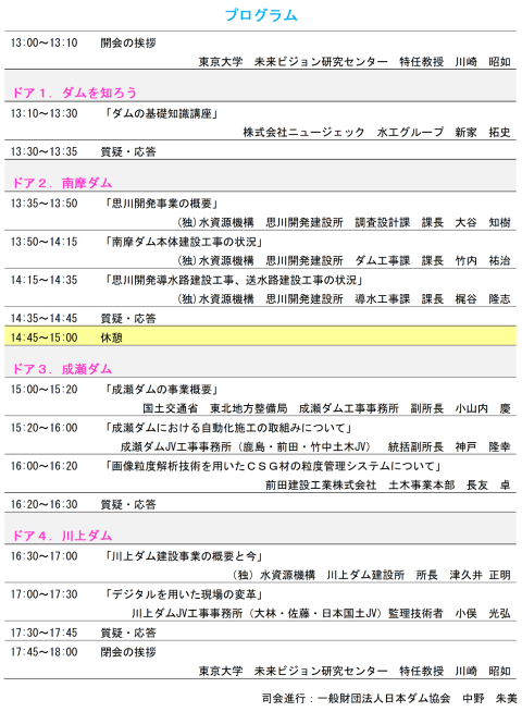 最後になりますが、今回ご講演いただいた南摩ダム・成瀬ダム・川上ダムの皆様、若手の会実行委員の皆様、ご協力いただいた皆様に改めてお礼を申し上げます。ありがとうございました。