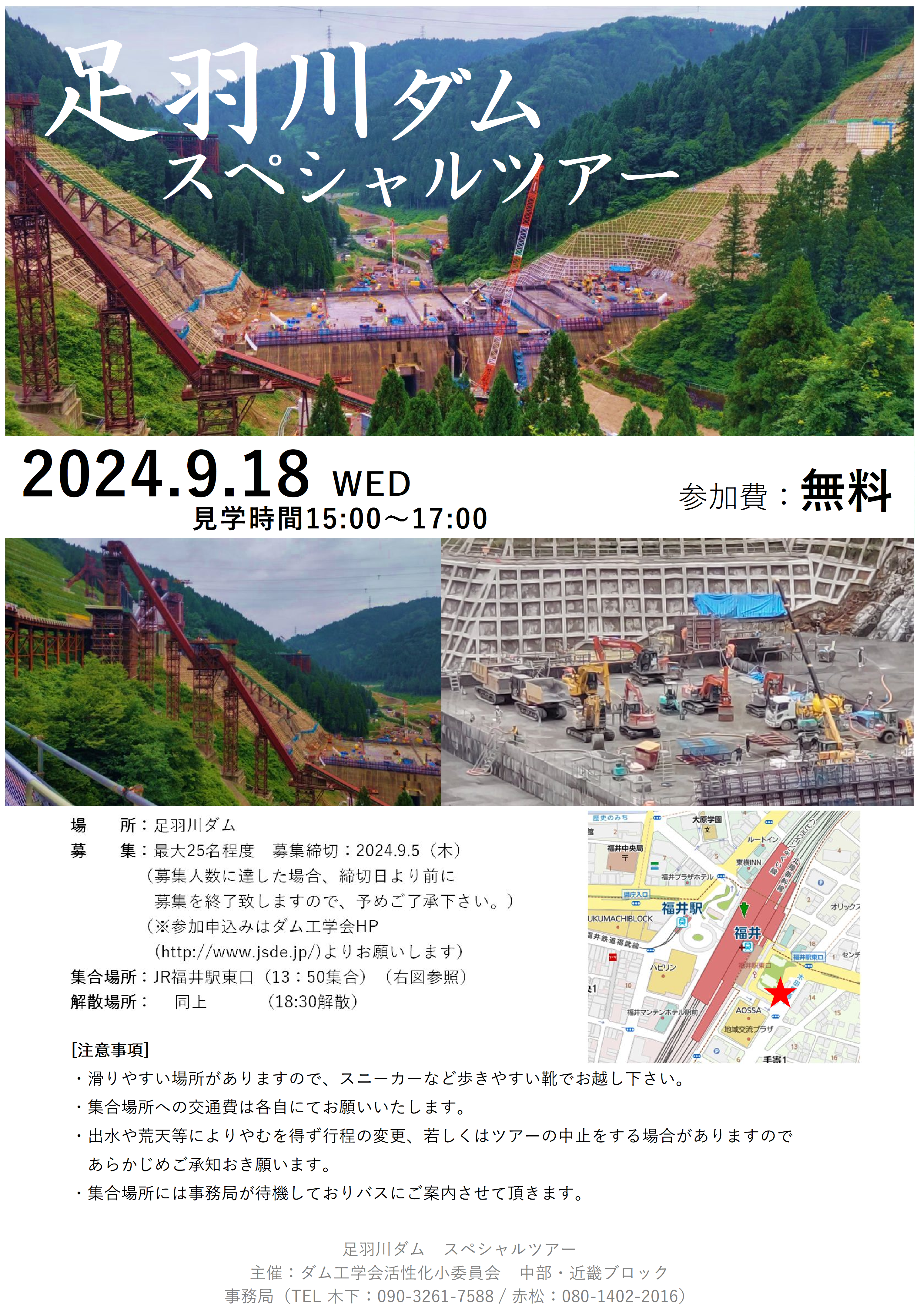 With Dam ★ Nightとは別日程で、足羽川ダムの見学ツアーを開催いたしました。同日にダム工学会の若手の会による「足羽川ダム、真名川ダム見学会」も開催されました。