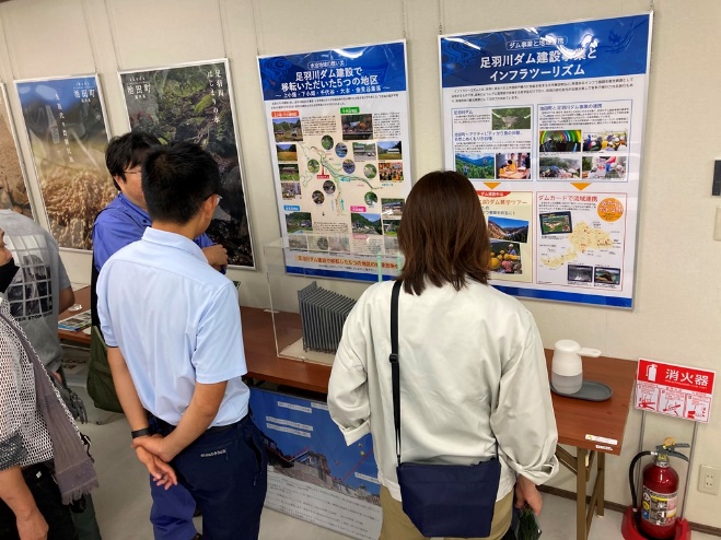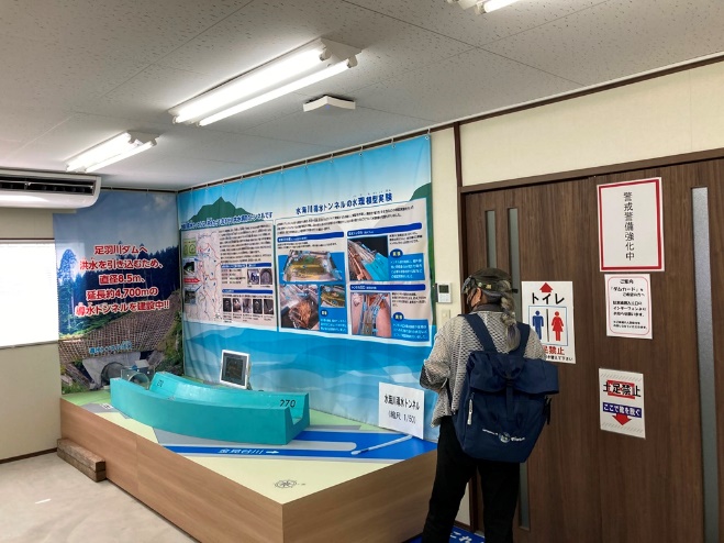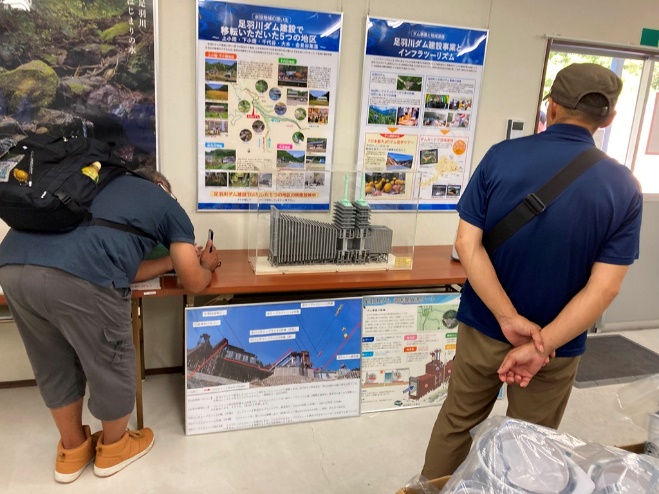 再び貸切バスでダムギャラリーあすわへ戻り、足羽川ダム工事事務所職員より足羽川ダムの事業説明を25分程度、河床部放流設備の模型やポスター見学を15分程度行いました。