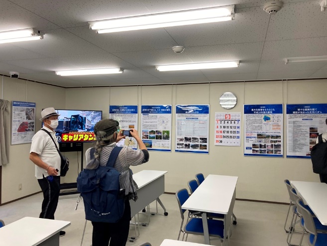 足羽川ダムの事業説明では、契機となった福井豪雨の被害状況や福井市中心部の標高と足羽川・九頭竜川・日野川の計画高水位の関係、流水型ダムの特徴、洪水時に水海川の水を引き込むための水海川導水トンネルなどのご説明をしていただきました(写真-6,7)。 説明後には参加者からの質問もあり、活発な質疑応答が繰り広げられていました(写真-8)。 模型やポスター見学では、既に堤体内に埋設してしまっている河床部放流設備の模型や据付時の動画などを熱心に見学・撮影されていました(写真-9,10,11)。