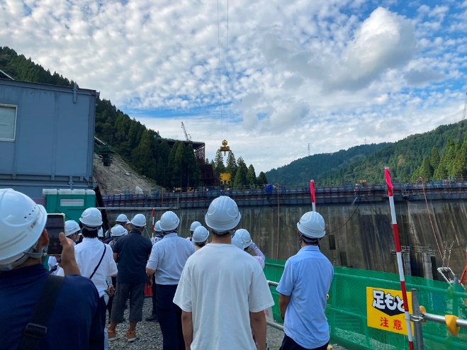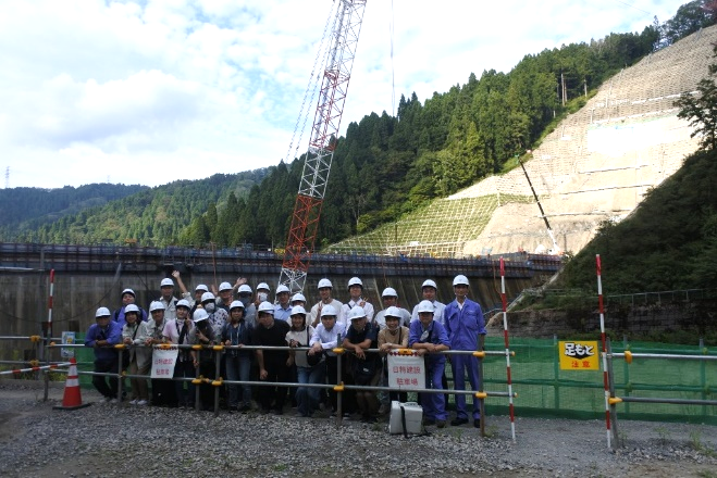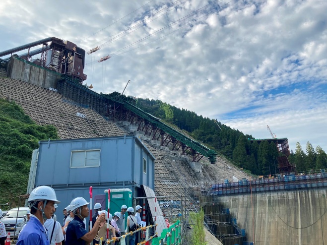 ダムサイトでは工事の進捗状況の説明がありました(写真-2)。ケーブルクレーンによる堤体打設が行われており、参加者の皆さんがその様子を撮影されていました(写真-3)。 また、急傾斜ベルトコンベアを使った骨材プラントからバッチャープラントへの骨材輸送の音などを聞くことができ、普段見ることできない視点での施工状況を見学されていました(写真-4)。 また、堤体上流面をバックに集合写真を撮影しました(写真-5)。