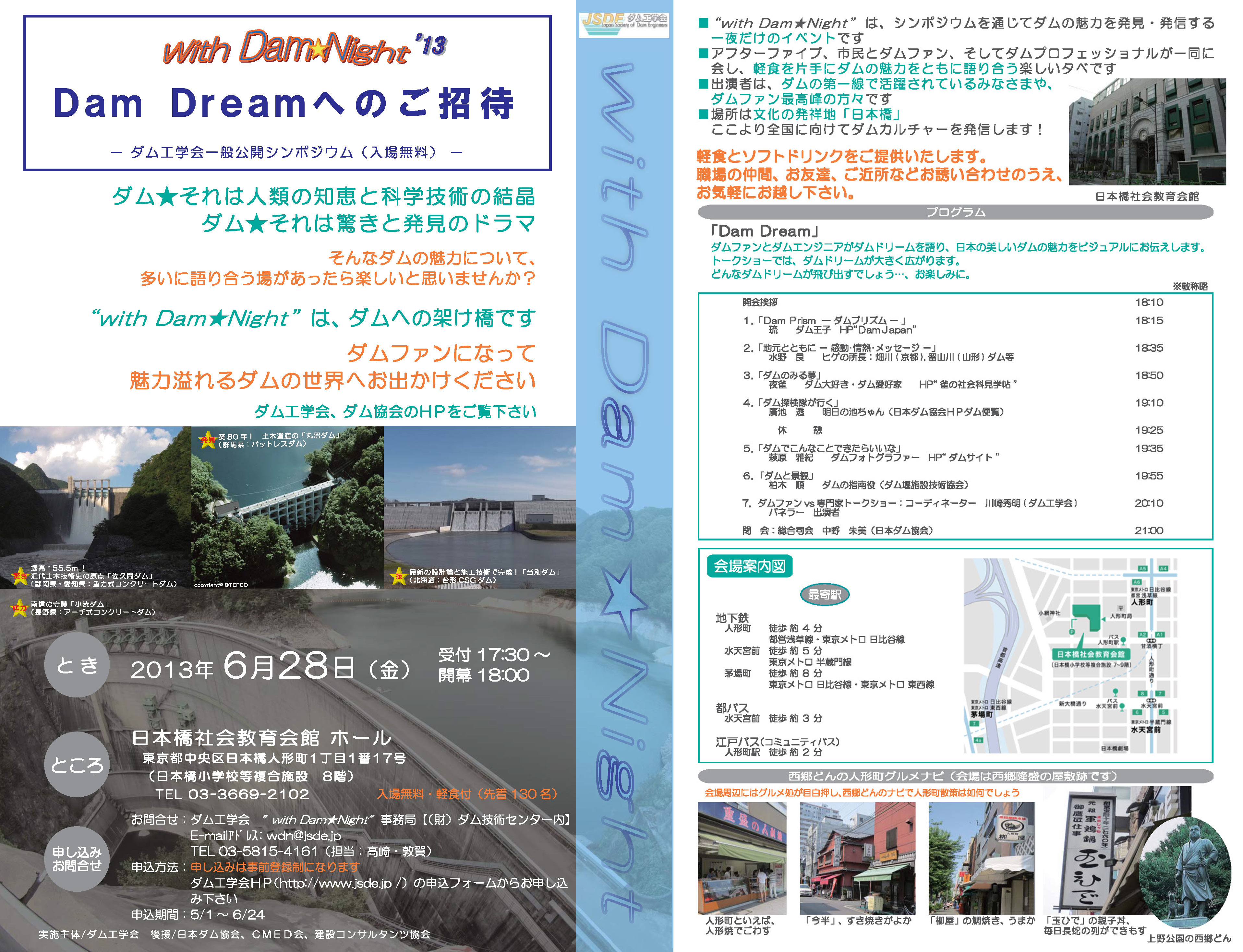 今回のwith Dam Night 2013は、東京開催としては2年ぶりであり、6月28日(金曜)に2011年と同じ日本橋社会教育会館において「ダムドリーム」をテーマに開催した。