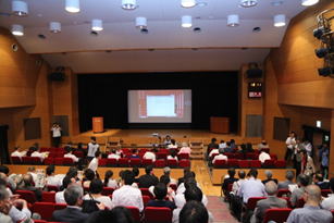 最初に開会の挨拶として、ダム工学会 魚本健人会長から、「昨年度よりも2~3割増の入場数、抱夢(ダム)のスタッフベスト等」の紹介とともにダム工学会活動の意義と日頃のご支援への感謝等の言葉を頂きました(写真4)。