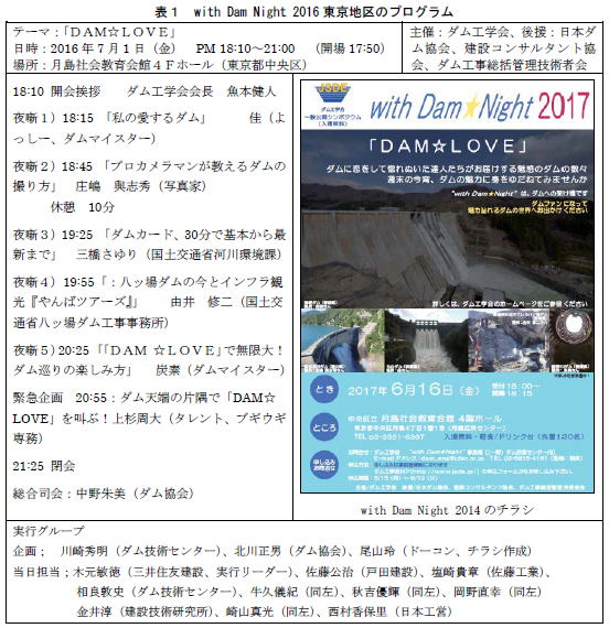 表-1に今回の全体プログラムとチラシの表面を示しますが、今回のプログラムは、メッセージ性をあまり出さずに単純に楽しむような内容にしたのも、一般の方の参加の大幅増につながったのかもしれません。このようにダムに関する社会的な興味が増すことが、我々ダム工学会の活性化活動の目的でもあるわけです。
