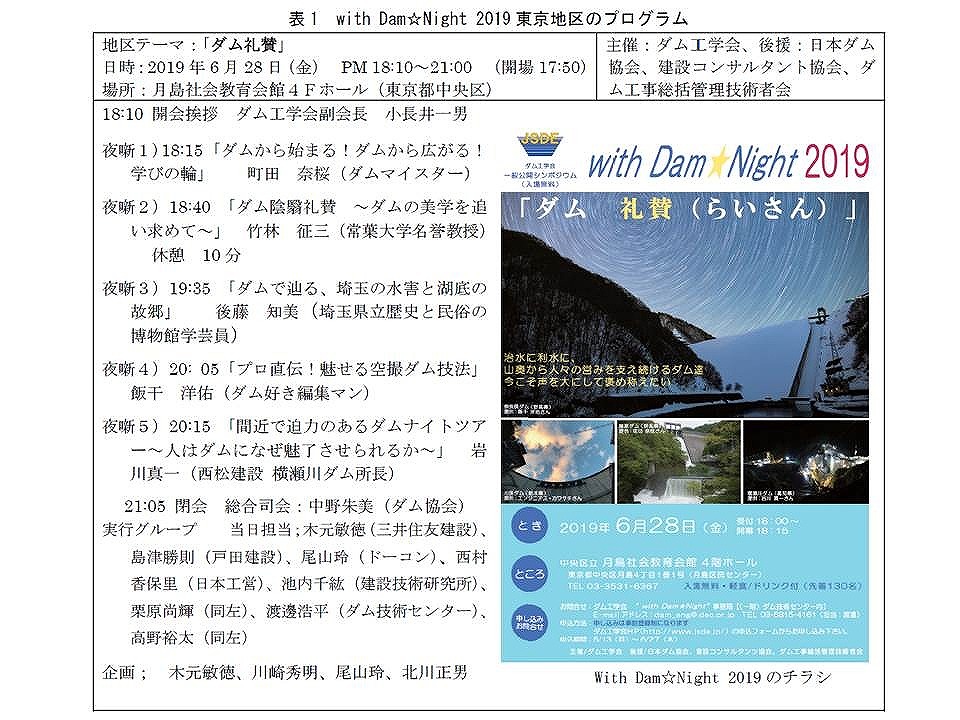 「with Dam☆Night(ウィズダム・ナイト)」は、市民とダム技術者との交流を通してダムに関する知識や情報を社会に発信するとともにダム見学に出かけるための「ダムへの架け橋」になることを目指すものです。